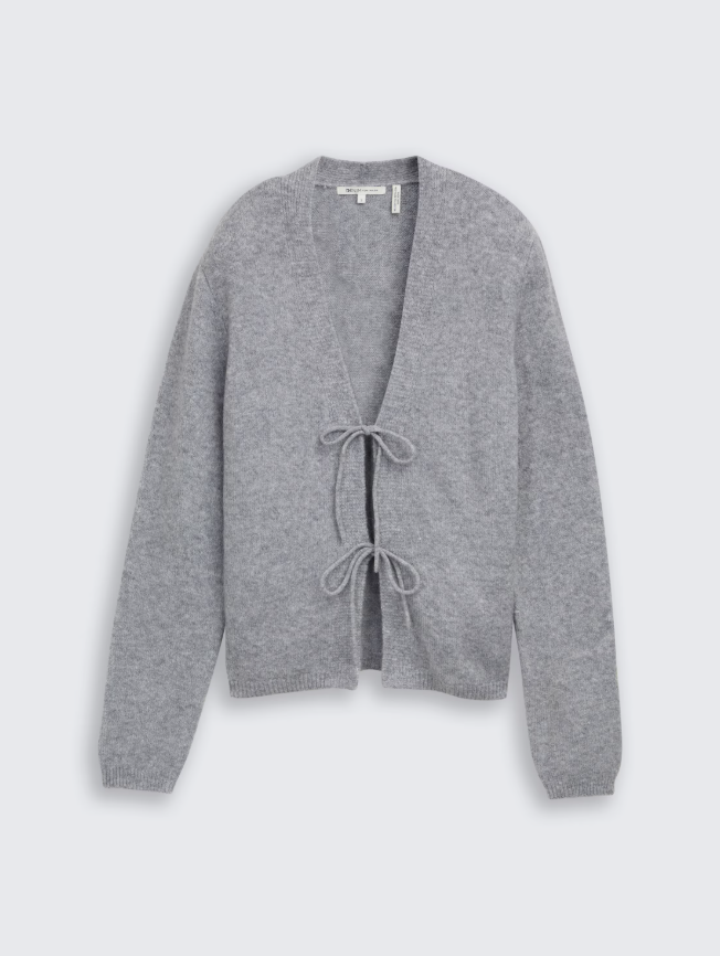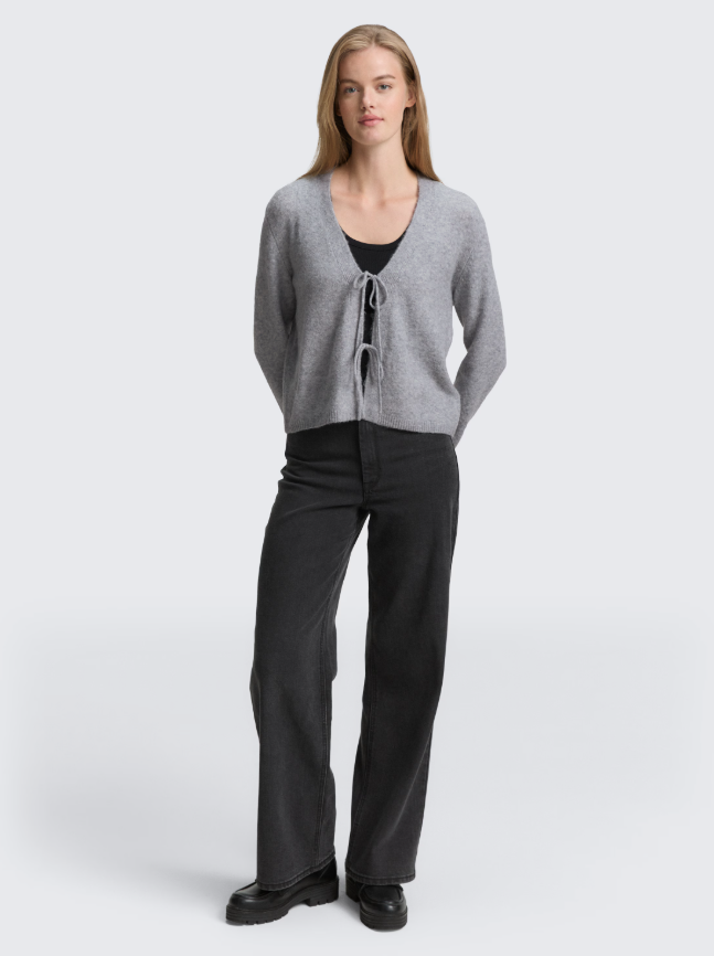 Modèle : Cardigan à col en V avec attaches à nouer à l’avant