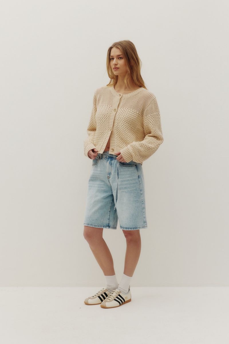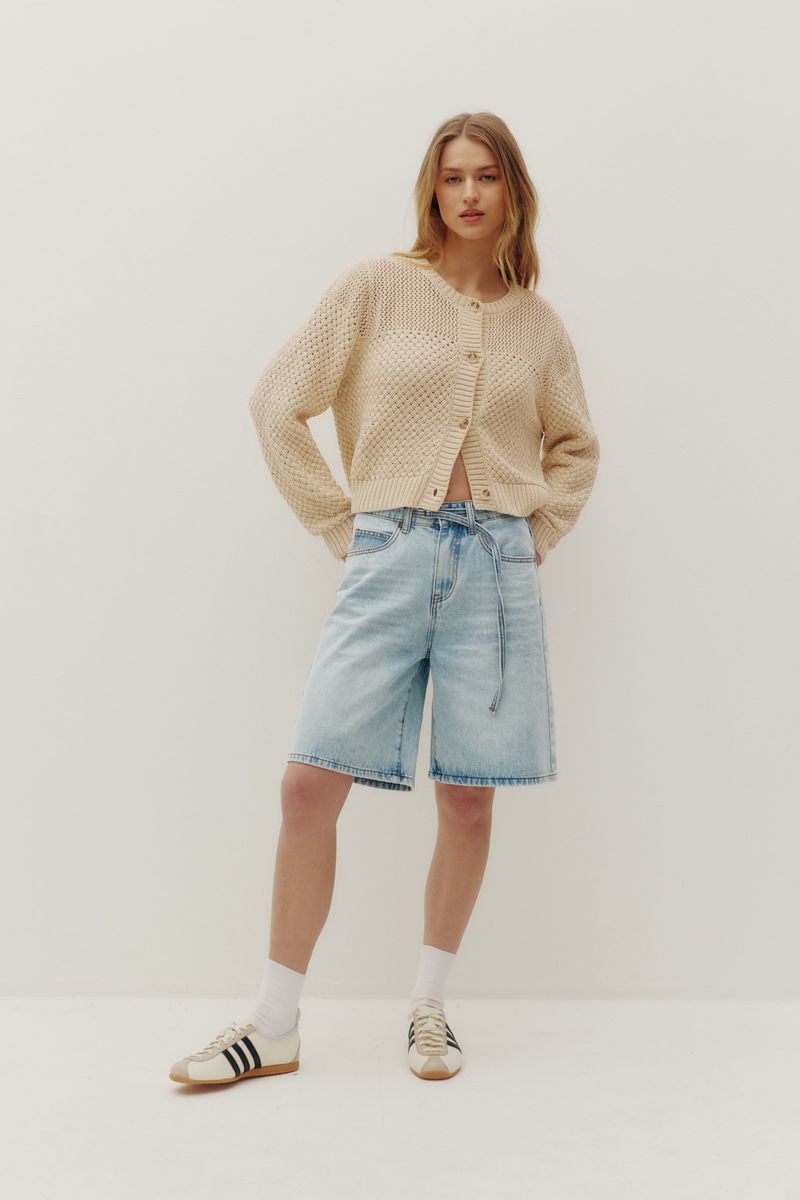 Ce cardigan en maille crème séduit par sa texture riche et son allure délicatement rétro. Sa coupe régulière et sa longueur légèrement écourtée en font une pièce facile à superposer, parfaite pour compléter un look féminin et soigné. Un essentiel polyvalent qui s’intègre naturellement au quotidien S3.