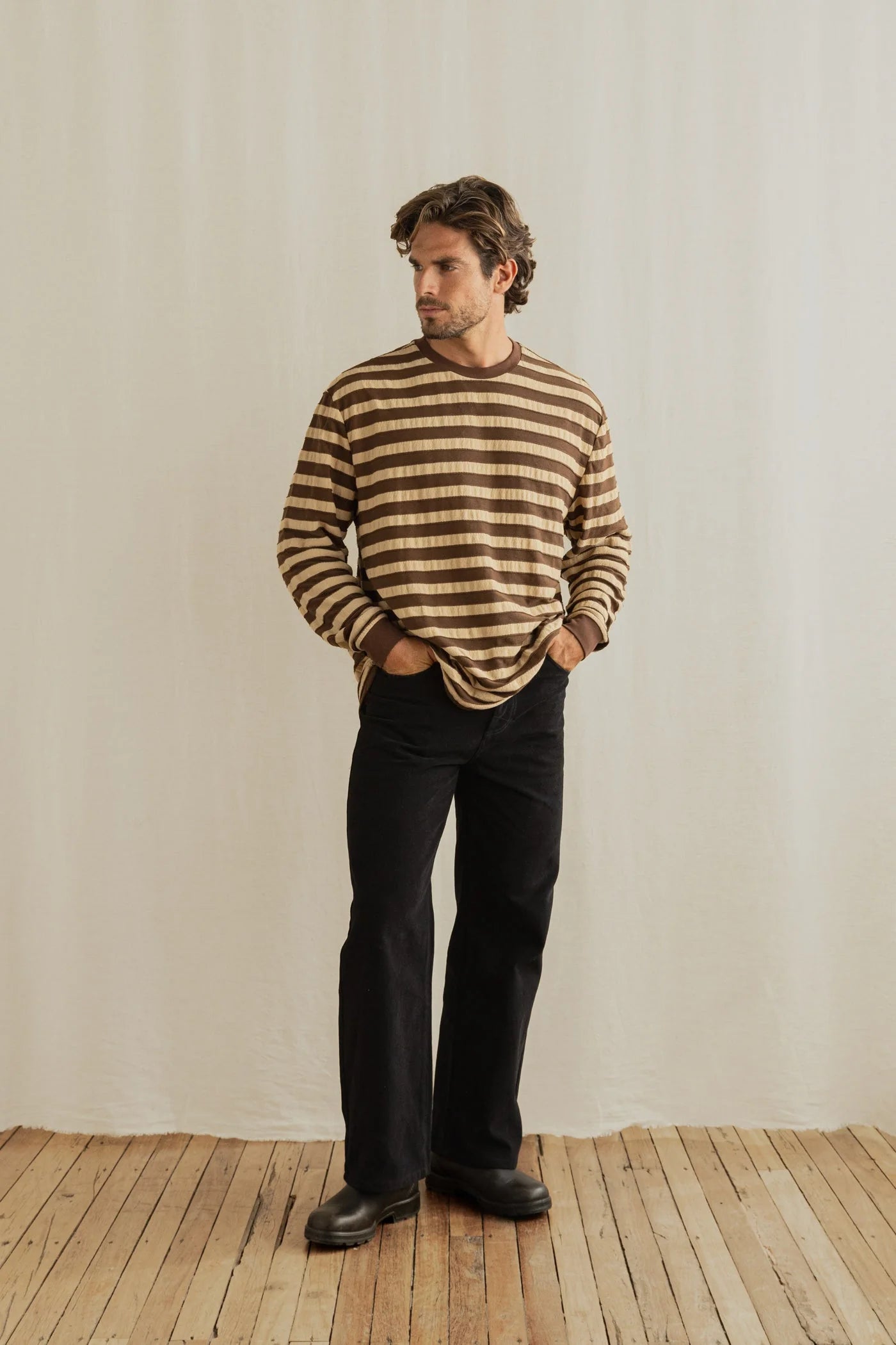 Ce chandail à rayures texturées combine une allure intemporelle à une coupe facile à porter. Son tricot doux et respirant offre un confort naturel, tandis que sa silhouette ample crée un look décontracté parfait pour le quotidien. Inspiré d’un style légèrement vintage, il se porte aussi bien avec un jean qu’un pantalon plus habillé.
