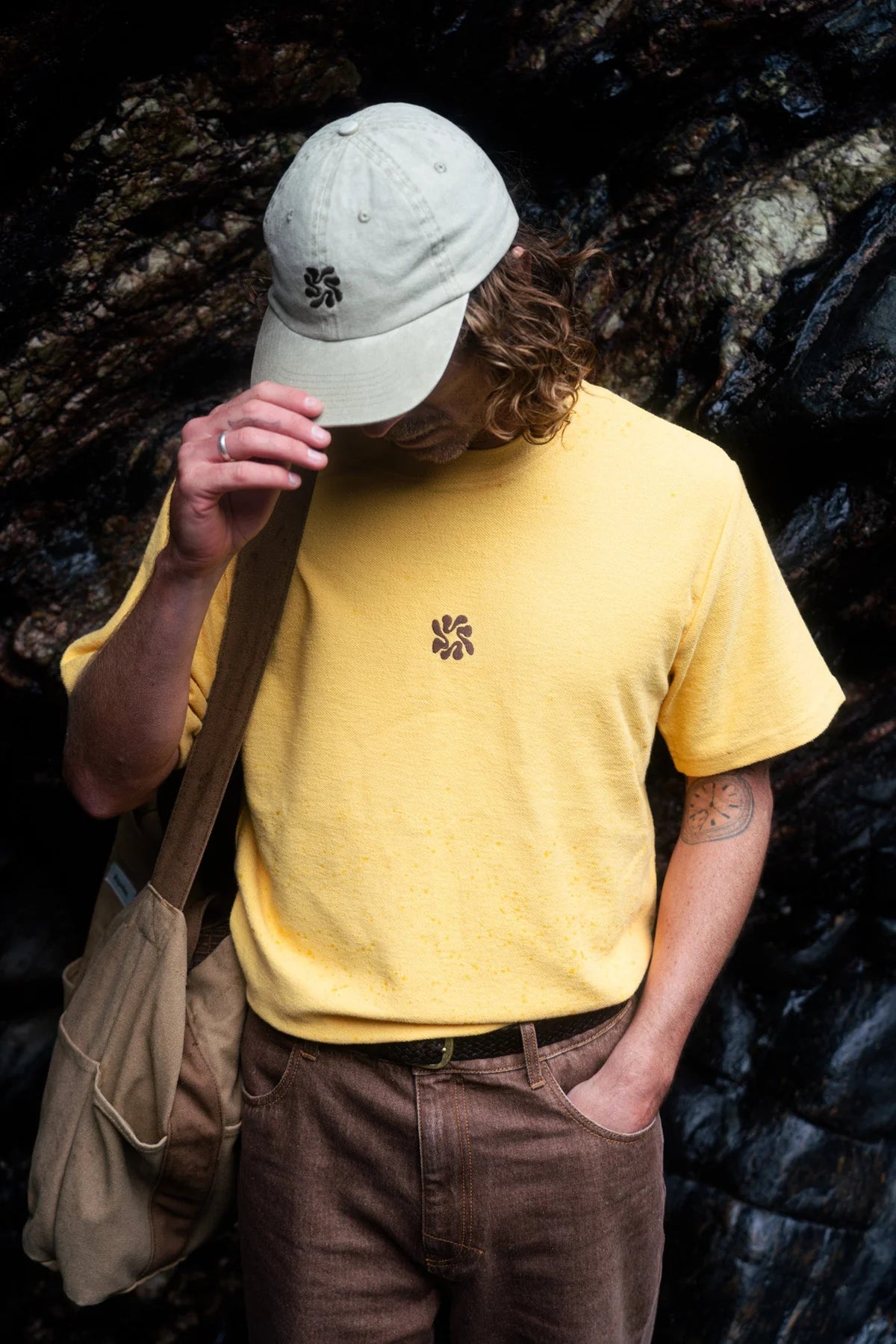 Détail : broderie centrée sur le devant, attache en laiton réglable, twill teint par pigments